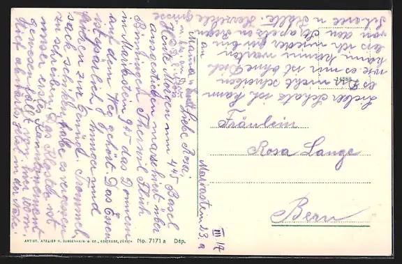 Personenbezogene Daten auf der Rückseite der Karte wurden durch blauen Textmarker unkenntlich gemacht. Die blauen Stellen sind auf die Vorderseite durchgeweicht und wirken sich negativ auf das Postkartenfoto aus