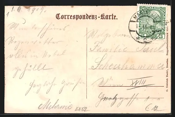 Personenbezogene Daten auf der Rückseite der Karte wurden durch blauen Textmarker unkenntlich gemacht. Die blauen Stellen sind auf die Vorderseite durchgeweicht und wirken sich negativ auf das Postkartenfoto aus