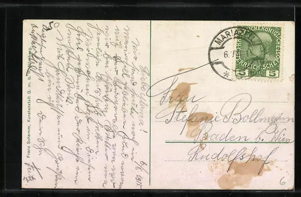 Personenbezogene Daten auf der Rückseite der Karte wurden durch blauen Textmarker unkenntlich gemacht. Die blauen Stellen sind auf die Vorderseite durchgeweicht und wirken sich negativ auf das Postkartenfoto aus