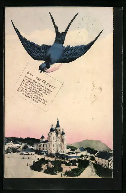 AK Mariazell, Kirche, Schwalbe mit Gedicht im Schnabel