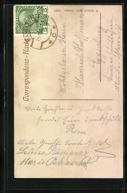 Personenbezogene Daten auf der Rückseite der Karte wurden durch blauen Textmarker unkenntlich gemacht. Die blauen Stellen sind auf die Vorderseite durchgeweicht und wirken sich negativ auf das Postkartenfoto aus