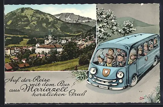 AK Mariazell, Ortsansicht, Passepartout mit Kindern in einem Autobus