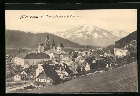 AK Mariazell, Ortsansicht mit Gemeindealpe und Ötscher