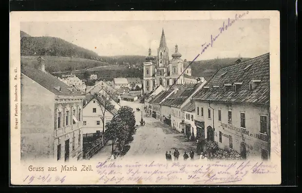 AK Mariazell, Ortspartie mit Gasthof zur goldenen Kanone aus der Vogelschau