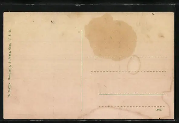 Personenbezogene Daten auf der Rückseite der Karte wurden durch blauen Textmarker unkenntlich gemacht. Die blauen Stellen sind auf die Vorderseite durchgeweicht und wirken sich negativ auf das Postkartenfoto aus