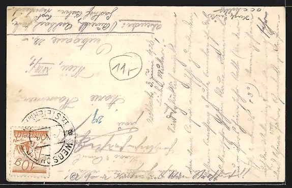 Personenbezogene Daten auf der Rückseite der Karte wurden durch blauen Textmarker unkenntlich gemacht. Die blauen Stellen sind auf die Vorderseite durchgeweicht und wirken sich negativ auf das Postkartenfoto aus