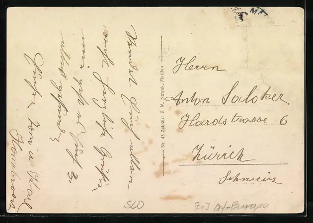 Personenbezogene Daten auf der Rückseite der Karte wurden durch blauen Textmarker unkenntlich gemacht. Die blauen Stellen sind auf die Vorderseite durchgeweicht und wirken sich negativ auf das Postkartenfoto aus
