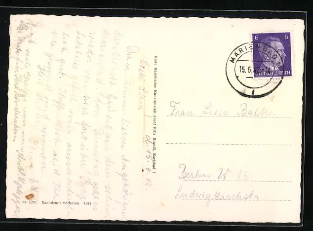 Personenbezogene Daten auf der Rückseite der Karte wurden durch blauen Textmarker unkenntlich gemacht. Die blauen Stellen sind auf die Vorderseite durchgeweicht und wirken sich negativ auf das Postkartenfoto aus