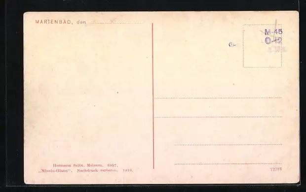 Personenbezogene Daten auf der Rückseite der Karte wurden durch blauen Textmarker unkenntlich gemacht. Die blauen Stellen sind auf die Vorderseite durchgeweicht und wirken sich negativ auf das Postkartenfoto aus