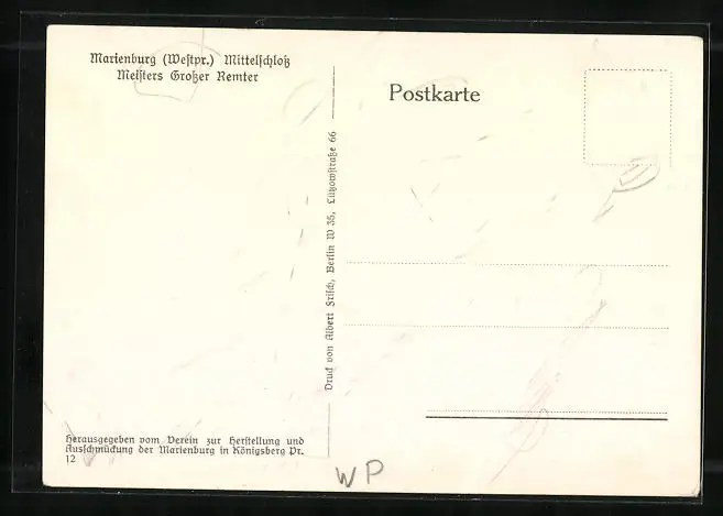 Personenbezogene Daten auf der Rückseite der Karte wurden durch blauen Textmarker unkenntlich gemacht. Die blauen Stellen sind auf die Vorderseite durchgeweicht und wirken sich negativ auf das Postkartenfoto aus