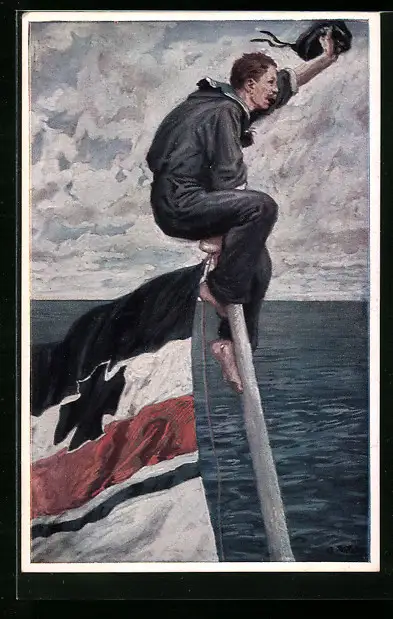 AK Marienesoldat in Uniform sitzt auf Fahnenmast