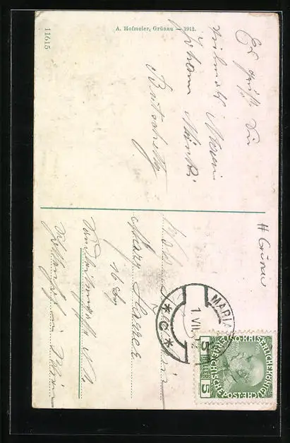Personenbezogene Daten auf der Rückseite der Karte wurden durch blauen Textmarker unkenntlich gemacht. Die blauen Stellen sind auf die Vorderseite durchgeweicht und wirken sich negativ auf das Postkartenfoto aus