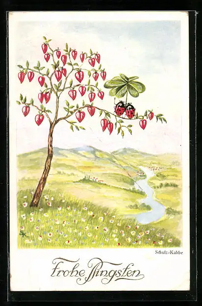 AK Marienkäfer-Paar auf einem blühenden Baum, Pfingstgruss