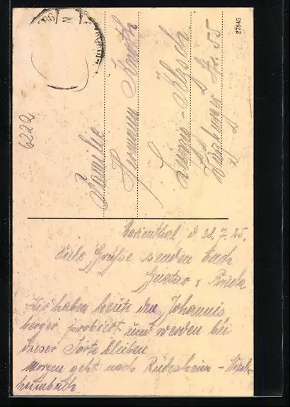 Personenbezogene Daten auf der Rückseite der Karte wurden durch blauen Textmarker unkenntlich gemacht. Die blauen Stellen sind auf die Vorderseite durchgeweicht und wirken sich negativ auf das Postkartenfoto aus