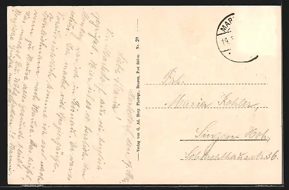 Personenbezogene Daten auf der Rückseite der Karte wurden durch blauen Textmarker unkenntlich gemacht. Die blauen Stellen sind auf die Vorderseite durchgeweicht und wirken sich negativ auf das Postkartenfoto aus