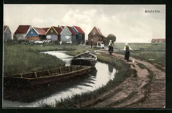 AK Marken, Uferpartie mit zwei Frauen und Booten