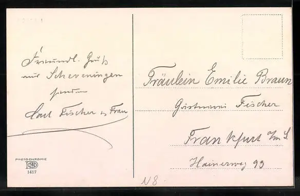 Personenbezogene Daten auf der Rückseite der Karte wurden durch blauen Textmarker unkenntlich gemacht. Die blauen Stellen sind auf die Vorderseite durchgeweicht und wirken sich negativ auf das Postkartenfoto aus