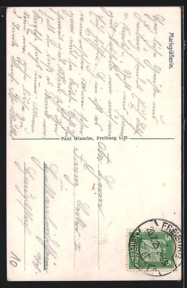 Personenbezogene Daten auf der Rückseite der Karte wurden durch blauen Textmarker unkenntlich gemacht. Die blauen Stellen sind auf die Vorderseite durchgeweicht und wirken sich negativ auf das Postkartenfoto aus