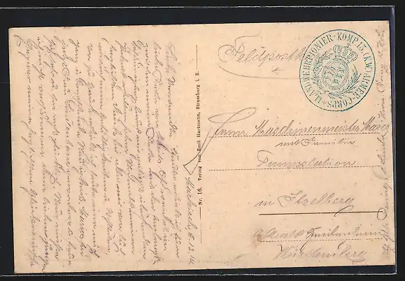 Personenbezogene Daten auf der Rückseite der Karte wurden durch blauen Textmarker unkenntlich gemacht. Die blauen Stellen sind auf die Vorderseite durchgeweicht und wirken sich negativ auf das Postkartenfoto aus
