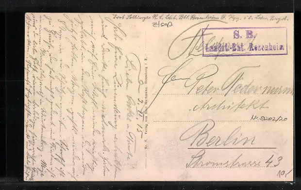 Personenbezogene Daten auf der Rückseite der Karte wurden durch blauen Textmarker unkenntlich gemacht. Die blauen Stellen sind auf die Vorderseite durchgeweicht und wirken sich negativ auf das Postkartenfoto aus