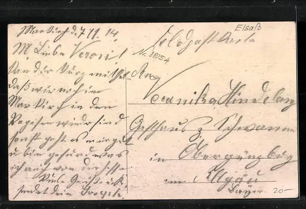 Personenbezogene Daten auf der Rückseite der Karte wurden durch blauen Textmarker unkenntlich gemacht. Die blauen Stellen sind auf die Vorderseite durchgeweicht und wirken sich negativ auf das Postkartenfoto aus