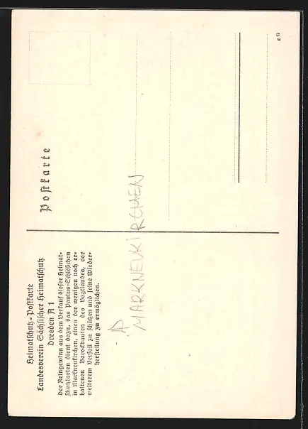 Personenbezogene Daten auf der Rückseite der Karte wurden durch blauen Textmarker unkenntlich gemacht. Die blauen Stellen sind auf die Vorderseite durchgeweicht und wirken sich negativ auf das Postkartenfoto aus