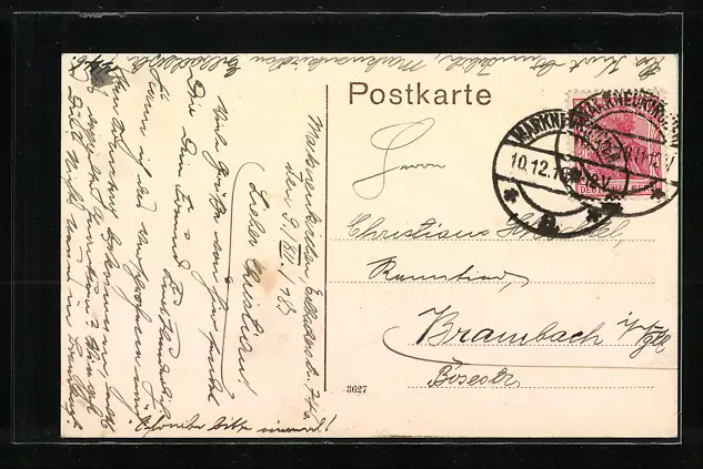 Personenbezogene Daten auf der Rückseite der Karte wurden durch blauen Textmarker unkenntlich gemacht. Die blauen Stellen sind auf die Vorderseite durchgeweicht und wirken sich negativ auf das Postkartenfoto aus