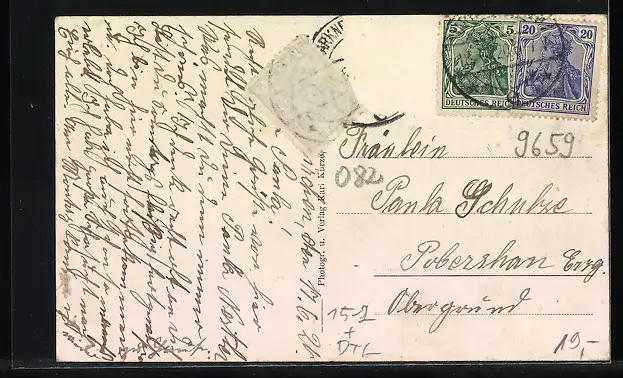 Personenbezogene Daten auf der Rückseite der Karte wurden durch blauen Textmarker unkenntlich gemacht. Die blauen Stellen sind auf die Vorderseite durchgeweicht und wirken sich negativ auf das Postkartenfoto aus