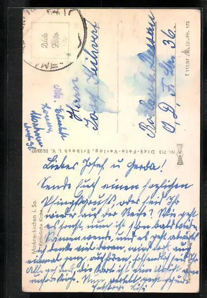 Personenbezogene Daten auf der Rückseite der Karte wurden durch blauen Textmarker unkenntlich gemacht. Die blauen Stellen sind auf die Vorderseite durchgeweicht und wirken sich negativ auf das Postkartenfoto aus