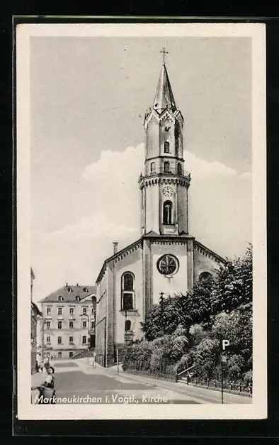 AK Markneukirchen i. Vogtl., Strassenpartie mit der Kirche