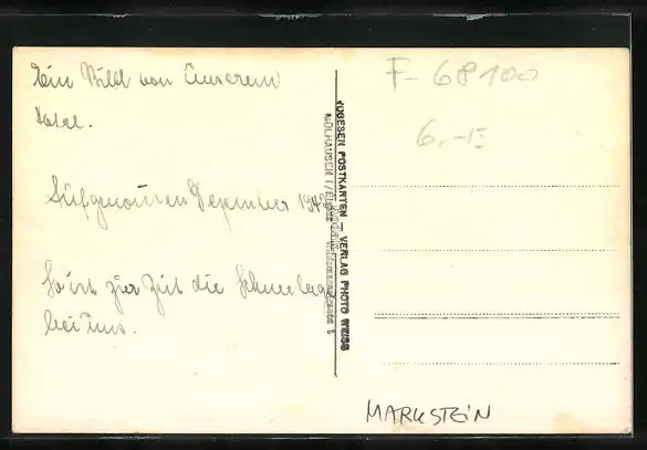 Personenbezogene Daten auf der Rückseite der Karte wurden durch blauen Textmarker unkenntlich gemacht. Die blauen Stellen sind auf die Vorderseite durchgeweicht und wirken sich negativ auf das Postkartenfoto aus