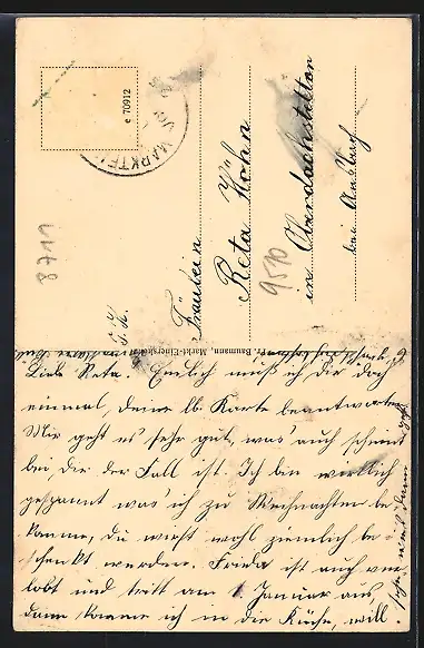 Personenbezogene Daten auf der Rückseite der Karte wurden durch blauen Textmarker unkenntlich gemacht. Die blauen Stellen sind auf die Vorderseite durchgeweicht und wirken sich negativ auf das Postkartenfoto aus