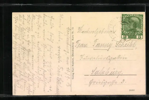 Personenbezogene Daten auf der Rückseite der Karte wurden durch blauen Textmarker unkenntlich gemacht. Die blauen Stellen sind auf die Vorderseite durchgeweicht und wirken sich negativ auf das Postkartenfoto aus