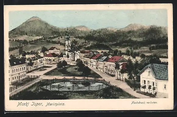 AK Markt Isper, Hauptplatz mit Teich, Kirche und Bergpanorama aus der Vogelschau