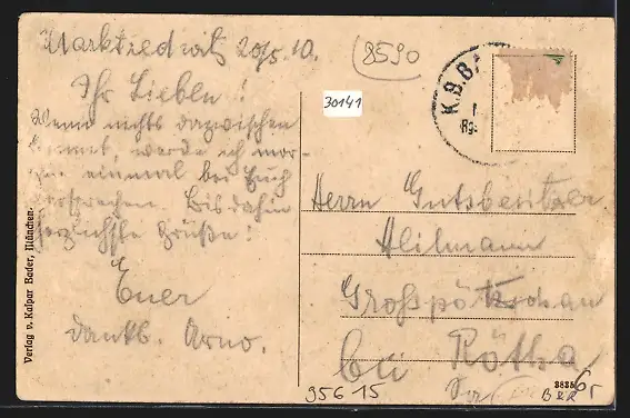 alte Ansichtskarte, gelaufen 1910, Briefmarke entfernt, rückseitig Oberflächenschaden, rückseitig Klebe- und Papierreste, guter Zustand