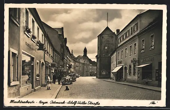 AK Marktredwitz, Strasse mit Adler-Apotheke und Geschäften