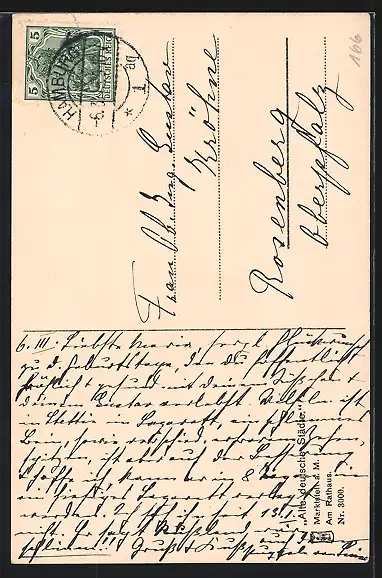 Personenbezogene Daten auf der Rückseite der Karte wurden durch blauen Textmarker unkenntlich gemacht. Die blauen Stellen sind auf die Vorderseite durchgeweicht und wirken sich negativ auf das Postkartenfoto aus