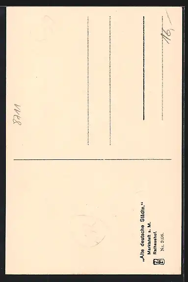 Personenbezogene Daten auf der Rückseite der Karte wurden durch blauen Textmarker unkenntlich gemacht. Die blauen Stellen sind auf die Vorderseite durchgeweicht und wirken sich negativ auf das Postkartenfoto aus