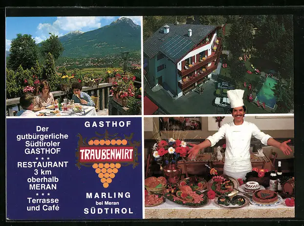 AK Marling bei Meran, Gasthof Traubenwirt aus der Vogelschau, Totalansicht