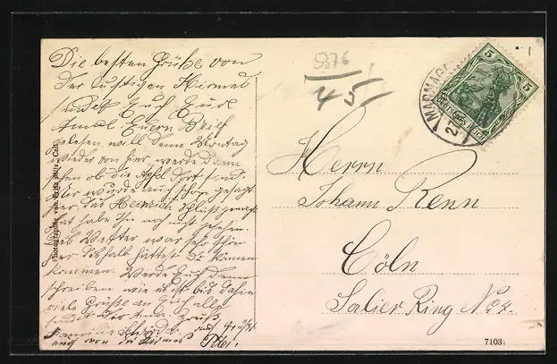 Personenbezogene Daten auf der Rückseite der Karte wurden durch blauen Textmarker unkenntlich gemacht. Die blauen Stellen sind auf die Vorderseite durchgeweicht und wirken sich negativ auf das Postkartenfoto aus