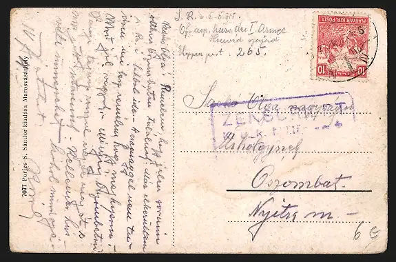 Personenbezogene Daten auf der Rückseite der Karte wurden durch blauen Textmarker unkenntlich gemacht. Die blauen Stellen sind auf die Vorderseite durchgeweicht und wirken sich negativ auf das Postkartenfoto aus