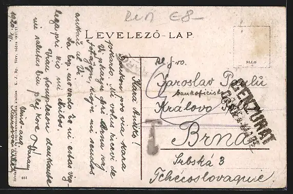 Personenbezogene Daten auf der Rückseite der Karte wurden durch blauen Textmarker unkenntlich gemacht. Die blauen Stellen sind auf die Vorderseite durchgeweicht und wirken sich negativ auf das Postkartenfoto aus
