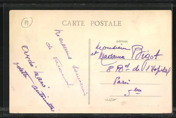 Personenbezogene Daten auf der Rückseite der Karte wurden durch blauen Textmarker unkenntlich gemacht. Die blauen Stellen sind auf die Vorderseite durchgeweicht und wirken sich negativ auf das Postkartenfoto aus
