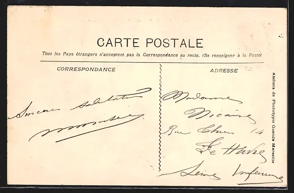 Personenbezogene Daten auf der Rückseite der Karte wurden durch blauen Textmarker unkenntlich gemacht. Die blauen Stellen sind auf die Vorderseite durchgeweicht und wirken sich negativ auf das Postkartenfoto aus