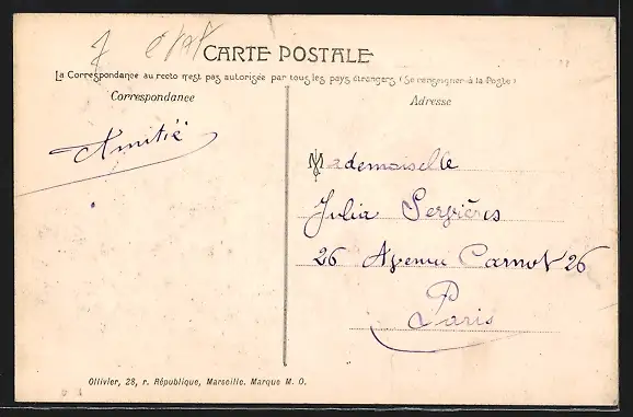 Personenbezogene Daten auf der Rückseite der Karte wurden durch blauen Textmarker unkenntlich gemacht. Die blauen Stellen sind auf die Vorderseite durchgeweicht und wirken sich negativ auf das Postkartenfoto aus
