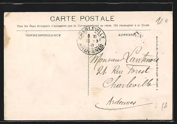 Personenbezogene Daten auf der Rückseite der Karte wurden durch blauen Textmarker unkenntlich gemacht. Die blauen Stellen sind auf die Vorderseite durchgeweicht und wirken sich negativ auf das Postkartenfoto aus
