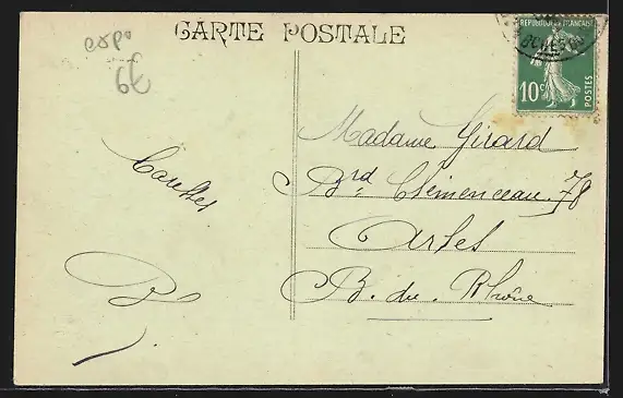 Personenbezogene Daten auf der Rückseite der Karte wurden durch blauen Textmarker unkenntlich gemacht. Die blauen Stellen sind auf die Vorderseite durchgeweicht und wirken sich negativ auf das Postkartenfoto aus