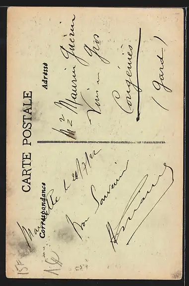 Personenbezogene Daten auf der Rückseite der Karte wurden durch blauen Textmarker unkenntlich gemacht. Die blauen Stellen sind auf die Vorderseite durchgeweicht und wirken sich negativ auf das Postkartenfoto aus