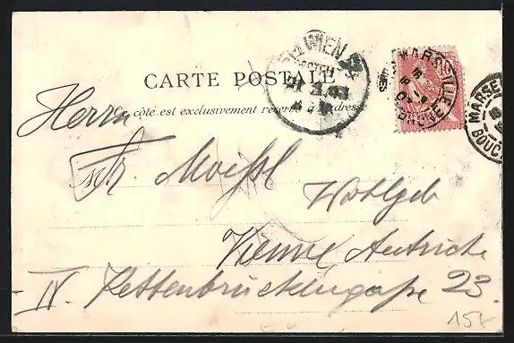 Personenbezogene Daten auf der Rückseite der Karte wurden durch blauen Textmarker unkenntlich gemacht. Die blauen Stellen sind auf die Vorderseite durchgeweicht und wirken sich negativ auf das Postkartenfoto aus