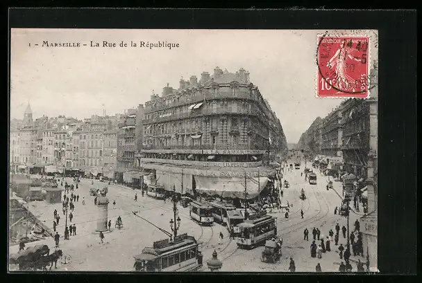 AK Marseille, La Rue de la République, Strassenpartie mit Strassenbahn
